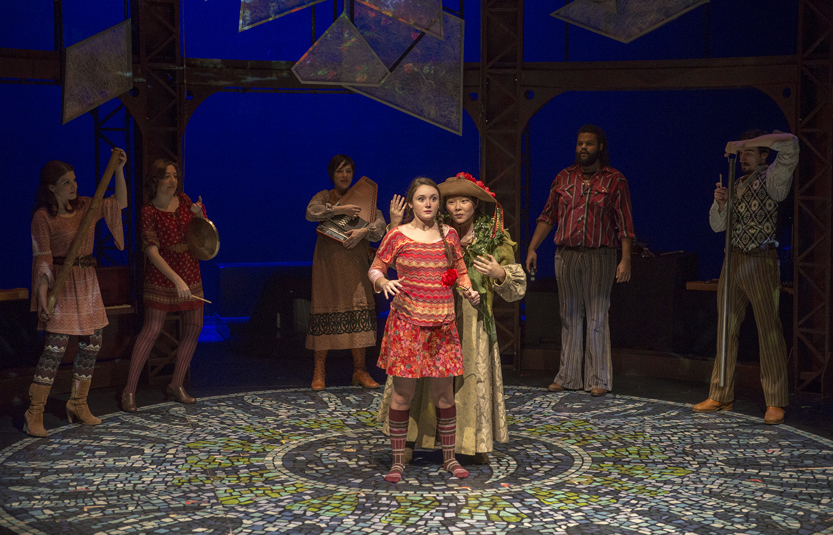 Tvivlsomme karakterer er også, hvad Elly møder på sin vej eller selv har med sig. Blomsterkonen er en lumsk heks og hendes kat en glubsk satan, hvis kløer Elly og hendes spurvefølge kun med nød og næppe undslipper. Det samme gælder den lede forkælede røverpige, mens Ellys hjælpere indbefatter et ubehjælpsomt rensdyr og den oversnakkesalige ledsagespurv. Andersens spirituelle kritik af intellektualismen som en forførende specialisering er tilsvarende hos Gates blevet forsimplet til populistisk antiintellektualisme. De tekniske finurligheder og grovheder, som Warner Erothers excellerer i, har en underholdningsværdi, som forestillingen på Park Square Theatre ikke var immun overfor. Men man var sig underholdningens pris rimeligt bevidst og lod sig ikke forblinde af den. I vigtige henseender fulgte man Andersens kort over eksistensspørgsmål og -konflikter som vejviser til egne møder med disses udspring, omend afbrudt undervejs af muntre stemningsløft og hvilepunkter for et bredere og yngre publikum.