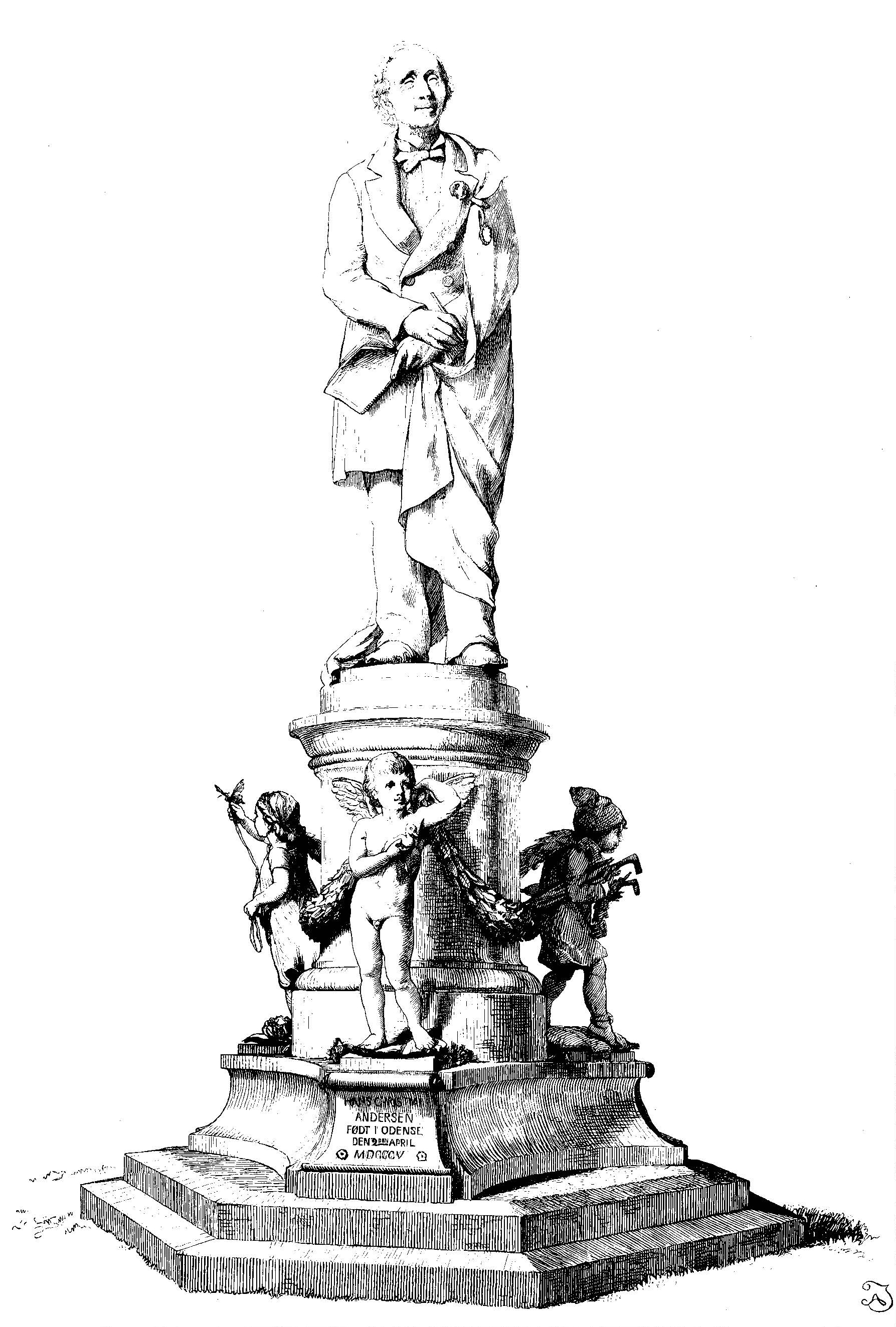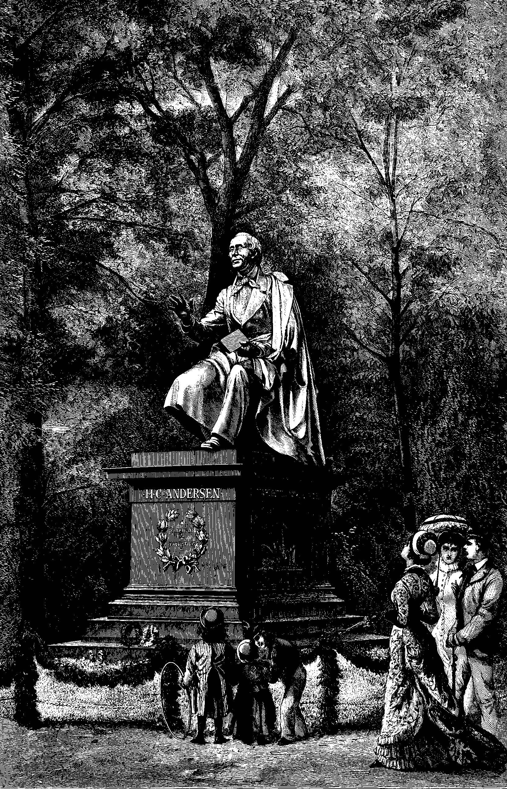 To af Konstakademiets Professorer spaserede en Eftermiddag i Rosenborg Have, og da udbrød den ene: “Her skulde H.C. Andersen staa!” Den anden sagde Ja, og da de kom hjem, grebe de øieblikkelig Sagen praktisk an, idet de talte derom til de forsamlede Damer; disse bleve hurtig vundne for Tanken og dannede snart en ivrig Propaganda for den. Helt uden Hindringer kom ldeen dog ikke til Realisation, og Digtererr havde ved Siden af sin Glæde flere Sorger af den. For det Første var han strax bekymret over, hvad Folk vilde sige, og for det Andet fik han slemme Ærgrelser i Anledning af de Skizzer, som fremkom efter Indbydelse til Concurrence. Flere af disse Skizzer – 16 fra 10 Konstnere – havde nemlig sat Æventyrdigteren i en æventyrfortællende Situation med Børn ved Siden, og blandt Andet gjalt Dette om den Skizze, som der fra flere Sider syntes at være mest Stemning for. Tanken om at lade lyttende Børn figurere ved Siden af H.C. Andersen, kunde være frernkommen ved Forestillingen om, at han fornemmelig var Børnenes Digter, men kunde derhos synes plastisk begrundet med Hensyn til H.C. Andersens lidet plastiske Figur. Hvad det sidstnævnte Punkt angik, viste det sig dog, at Vanskeligheden lod sig overvinde, og det maa erkjendes, at det Genre-Artede i en Composition med Børn i og for sig passede mindre godt, naar Meningen dog var at reise et Mindesmrerke af virkelig monumental Charakter. Men H.C. Andersen, der vistnok ogsaa iøvrigt foretrak at foreviges alene, blev særlig stødt over at skulle have Børn ved sin Side, fordi han – som personlig langt mindre var en Børneven i Virkeligheden end i Fantasien – betragtede det som en halv Fornærmelse, at man ligesom vilde sige, at hans Forfatterskab væsentlig kun var en Digtning for Børn. Heri havde han efter vor Formening ingenlunde Uret; det Naive i hans Værker, selv i hans Æventyr, er i den Grad parret med en ofte skarp satirisk Reflexion, at Børn vel kunne le eller græde ved en stor Del af hans Æventyr, men tilfulde nydes disse dog kun af Voxne.