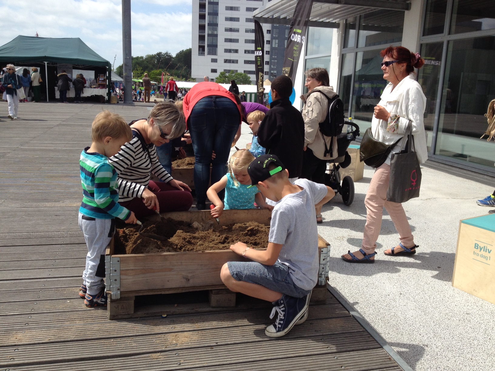 Opstarten og nyheden om en hundelort Som optakt til formidlingen på udgravningerne deltog museet på Odense Havnekulturfestival. Her kunne børn og barnlige sjæle foretage deres egen arkæologiske udgravning i to sandkasser med skjulte fund. Tilslutningen her gav et lille forvarsel om interessen for udgravningen, for sandkasserne var usædvanligt godt besøgt af børn, der ville grave efter knogler, og af voksne der ville høre om udgravningen.