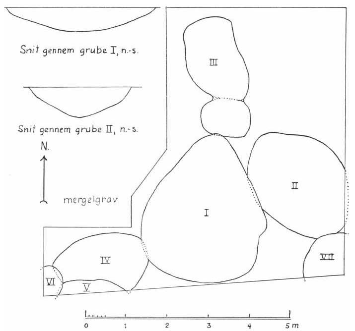 Også grube III udgravedes fuldstændigt, de øvrige, nr. IV-VII, derimod kun delvist, og der er ikke grund til at omtale dem i enkeltheder, da forholdene overalt svarede til det allerede beskrevne. Som det ses på planen, ligger alle nedgravningerne nær hinanden, tit således, at randene gled ind over hverandre, og indholdet først længere nede skiltes af opragende lerbalke fra undergrunden.