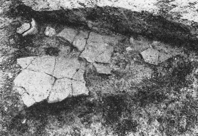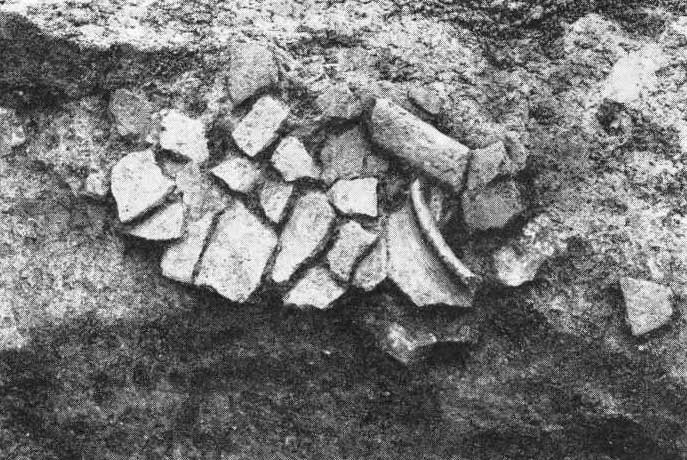 Overalt i gruben fandtes lerkarskår, endda i stor mængde, i alt godt et tusinde. På fotografiet fig. 2 ses en klynge skår ligge tæt sammen ved grubens midte, alle hørende til samme lerkar, og på det andet udgravningsbillede, fig. 3, ses flager af et meget stort kar, oprindelig 50-60 cm i tværsnit. Af sådanne kar var der to. Begge er de rester af de store lerbeholdere, der tit findes i jernalderens hustomter og brugtes til opbevaring af kornforrådet, så dette kunde holdes tørt og sikres mod museplagen. Ved den følgende behandling i museet af lerkarskårene viste det sig, at samtlige skår stammer fra mindst 30 forskellige kar: krukker, kander, kopper og bægre foruden de omtalte store forrådskar. Endelig fandtes 3 grove knusesten af den sædvanlige runde og facetslidte art, der har været benyttet som hamre til udbankning af slagger fra smedejernet, der udvandtes af myremalm.