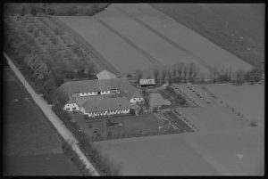 Foto af Vejlegården 1950. Pryddyssen med de to bronzealderurner ses nederst til højre i havens græsplæne. Foto: Sylvest Jensen Luftfoto; Det Kgl. Bibliotek.