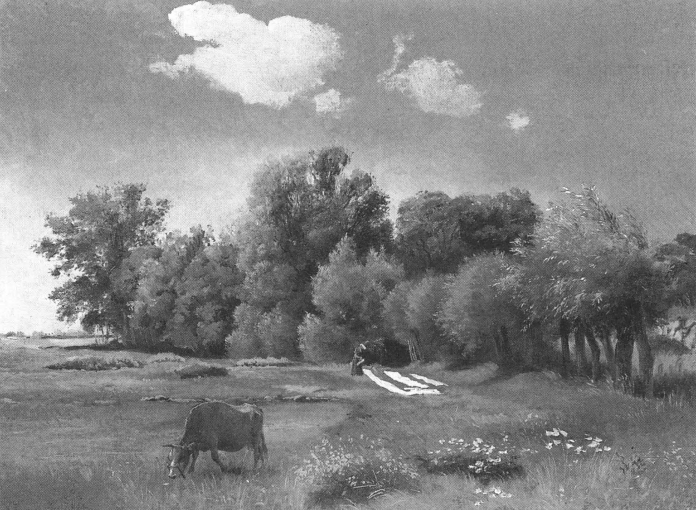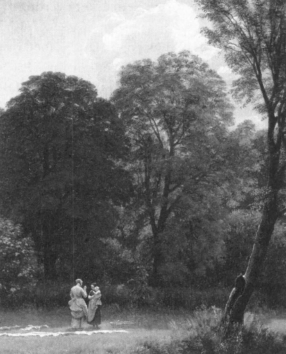 Lad mig skitsere forhistorien. Jens Juels landskabsbilleder markerer frigørelsen fra det mytologiske maleri hos Nicolai Abildgaard. C. W. Eckersberg bringer sine elever med ud i naturen og foreholder dem krav om iagttagelse. Christen Købke, hans elev, spiller en rolle som overgangsskikkelse.[35] Den indflydelsesrige kritiker N. L. Høyen inspirerer guldaldermalernes andengeneration til en nationalromantisk landskabsskildring, og J. Th. Lundbye, P. C. Skovgaard og Dankvart Dreyer leverer varen. De to førstnævnte, nære venner, modtog inspiration fra Grundtvigs folkelige tale og lagde sig holdningsmæssigt på en nationalliberal kurs.[36]