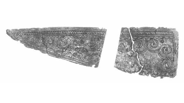 Helleristninger er foran nævnt. Faktisk er der en fuldstændig parallellitet imellem den og bronceristningeme, som rageknivsbillederne er kaldt.[43] Vi finder de samme skibstyper, de samme stævnprydelser, og de samme ledsagemotiver til skibene. Blot savner helleristningerne de mange bølgeornamenter, som er så karakteristiske for bronceornamentikken omkring år 800 før Kristi fødsel. Parallelliteten må betyde noget for tolkningen af rageknivsbillederne.