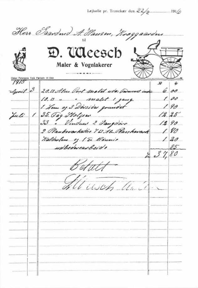Prisen for alt arbejdet var 800 kr. Det var prestige dengang. Man ville gerne have det lidt pænere på denne gård end på de andre, og så hentede man Weesch fra Lejbølle. Som tak for god behandling malede han et skilderi – et billede af den gamle Lohalsgård som den så ud før udflytningen.[7]