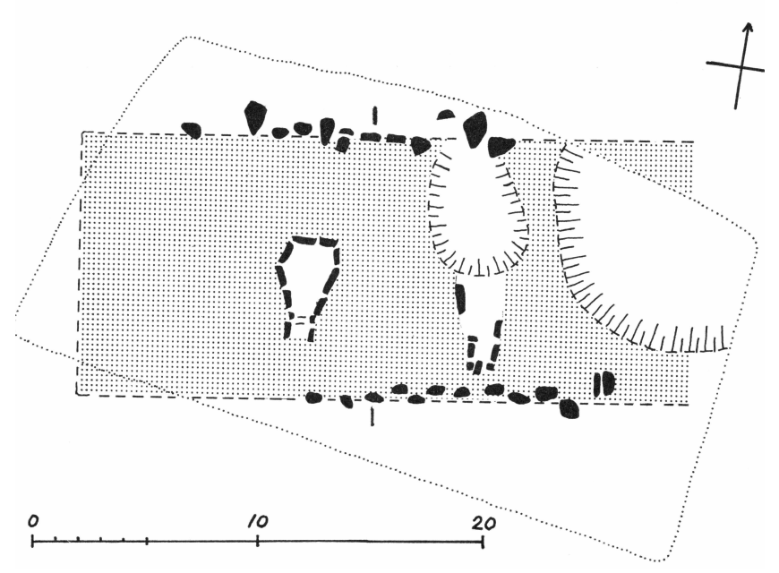 Det er hidtil omhyggeligt undgået at betegne denne høj som en langdysse og de store megalitter, der står foran stenpakningens front, som randsten. De har utvivlsomt stået omkring højen i dens første fase, men som en krans af monolitter omkring den egentlige høj. Alle iagttagelser under udgravningen og den senere bearbejdelse af fundstoffet taler herfor. Vigtigt er det i denne forbindelse, at skårgruppen foran højens østlige kammer udfyldte hele rummet mellem stensætningens front og monolitternes bagside, og også skårene af det store forrådskar fig. 14, der oprindeligt må have stået på høj overfladen over stensætningen, er indlejret i skredlaget på en sådan måde, at det forudsætter et åbent rum mellem stensætningen og monolitterne.