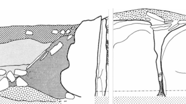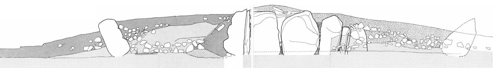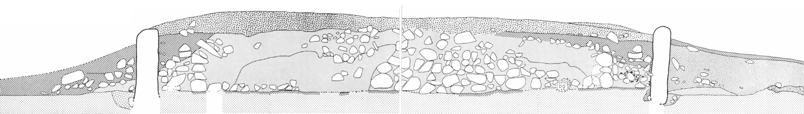 Den vegetationsdækkede jordoverflade, højen er rejst på, gav sig også i dette profil til kende som et tyndt, gråligt og finkornet sandlag, eller ved en på undergrunden lagt stenlægning. Fixeringen af den oprindelige jordoverflades niveau viser, at stengraven er rejst i en lav, afgravet fordybning på ca. 20 cm dybde, hvori bærestenene står understøttet af mindre sten. Nord for bærestenene er fordybningen fyldt op med sort, blandet sand, og herpå hviler en i bunden ca. 1 meter bred og ca. 1,30 meter høj lerpakning, som indkapsler gravkammeret på alle sider indtil omkring 30 cm fra bærestenenes top. Leret er rent, næsten stenfrit og uden påviselig lagdeling. Dets plane, skrånende yderside, der danner en vinkel på ca. 45° i forhold til undergrunden, er i overfladen afdækket med store, ret tynde, flade stenfliser. Langs lerets fod ligger en i tværsnit trekantet stenpakning, opbygget med store, indtil 55 cm lange sten liggende yderst, og iøvrigt af større sten stablet i 2-3 skifter ind mod leret.