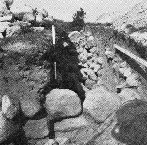 Gennem højens midte strækker sig en kærne opbygget af sten, i egentlig forstand en stenpakning, der er opbygget metodisk. Nederst, på stenalderens vegatationsdækkede jordoverflade, der i snittet fremtrådte som et ca. 3-4 cm tykt, gråligt og meget finkornet sandlag over undergrundssandet, lå 40-50 cm lange sten tæt sammenføjet i to skifter. Over denne nederste stenlægning var stenpakningens øverste del sammenstablet af gennemgående mindre sten, men uden den klare lagdeling i skifter, der blev konstateret i de to nederste stenlag. I profilvæggen var stenpakningen ca. 5 meter bred i bunden og ca. 1,30 meter høj; men der synes at være fjernet sten fra dens top. Gennem hele stenpakningen fra bunden til toppen lå stenene så tæt sammenføjet, at den relativt lille mængde sand, der var aflejret mellem stenene, må være sivet ind fra den omgivende sandede højfyld. Når profiltegningen fig. 2 tilsyneladende ikke underbygger denne opfattelse, er det teknisk betinget af opmålingens fixering til et givet lodret snit gennem højen. Pakningens kompakte natur fremgår derimod klart af fig. 3.