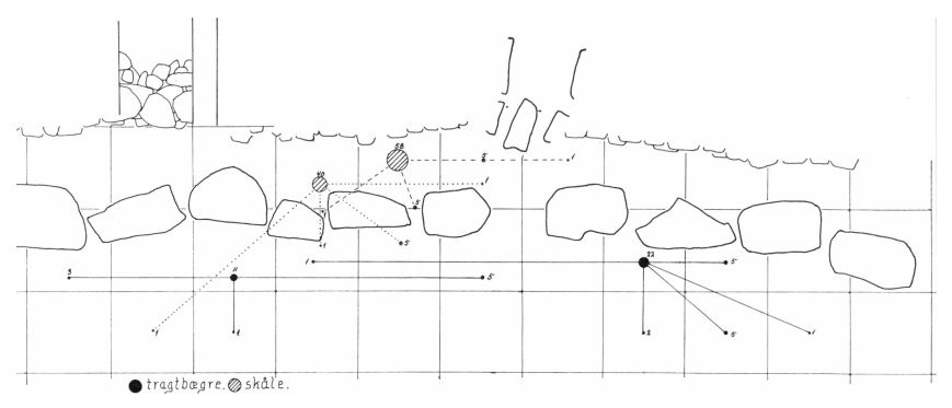 Derimod må de sakrale henstillinger af lerkar ved højen gøres til genstand for kort omtale. De deles naturligt efter fundsted i tre grupper, de to allerede omtalte foran stensætningens front, den tredie foran monolitterne/randstenenes yderside. Karakteristisk for lerkarhenstillingen bag monolitterne er, at der af de enkelte kar er bevaret et større antal skår end tilfældet er for lerkarrene, der er henstillet foran disse, og at skårene af det samme kar oftest udviser en ringe spredning, fig. 8. At skår af lerkar, der er henstillet bagved randstenene også forekommer foran disse, skyldes først og fremmest, at højfylden er sivet ud mellem megalitternes mellemrum, der ikke var lukket af tørmur. Skårene foran randstenene er derimod fundet indenfor et langt større antal kvadratmeterfelter, ligesom antallet af bevarede skår af de enkelte kar generelt er mindre end tilfældet er for karrene fra området mellem højens sydlige stensætning og randstenenes inderside. Betegnelsen sakrale lerkarhenstillinger anvendes her om keramikfund, der opfylder de krav Poul Kjærum stiller i publikationen af jættestuen Jordhøj: Aflejringsforholdene skal være forskellige for de to fundgrupper (lerkar knyttet til gravriter og udrømningsgods fra gravkamrene), og det skal altså udgravningsteknisk „være muligt at skille de to fundgrupper fra hinanden og kaste lys over deres indbyrdes forhold“.[15]