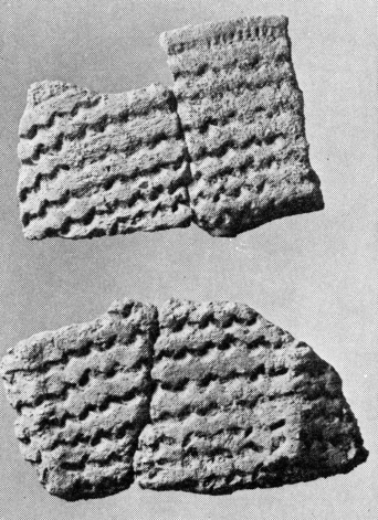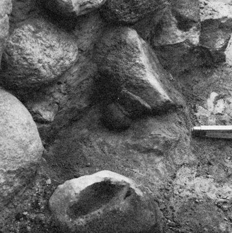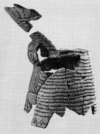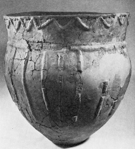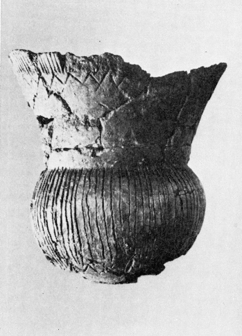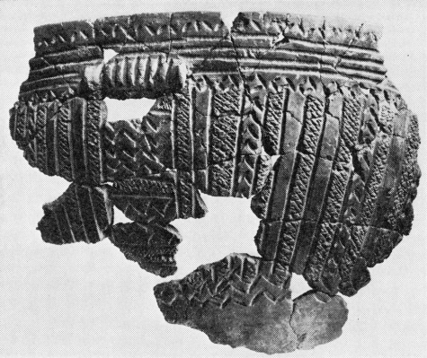 Det allerede omtalte forrådskar fig. 14, kan vel ikke som de ovenstående uden kommentarer dateres til periode I B. Men formen og dekorationen forekommer såvel i periode I som i II af mellemneolitisk tid. På bopladsen Troldebjerg, hvor hovedbebyggelsen tilhører periode I A, kendes det såvel med vinkellister under randen, som i kombinationen af disse og gruber.[17] På bopladsen Blandebjerg, der synes at tilhøre et tidligt afsnit af periode II, findes også en identisk ornamentik på skår af forrådskar.[18] Det imponerende, 45 cm høje kars stramme profil, vil stemme godt med en datering til periode I.