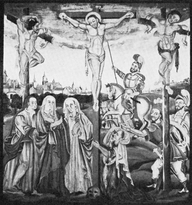 Vi møder imidlertid også en afvigende fortolkning af motivet. På et billede fra 1496 i Neüburg-klostret, tilskrevet den sydtyske mester Rueland Frueauf d.y., finder man således en opfattelse af Golgata-scenen, som skulle vise sig at blive fremherskende hele det følgende århundrede igennem. Her er livet omkring korsene vel middelalderens sædvanlige skildring af den folkeforlystelse, en henrettelse nu engang var, med et masseopbud af ligegyldige tilskuere, som flokkedes omkring den lille skare af bibelske og legendariske personer, som skulle være der. Men Kristi legeme hænger roligt og harmonisk, fæstnet med nagler til det retkantede og pænt tildannede kors, medens de to røvere nærmest grotesk er ophængt, bundet til to naturvoksede stammer, som kun primitivt har fået korsets form.