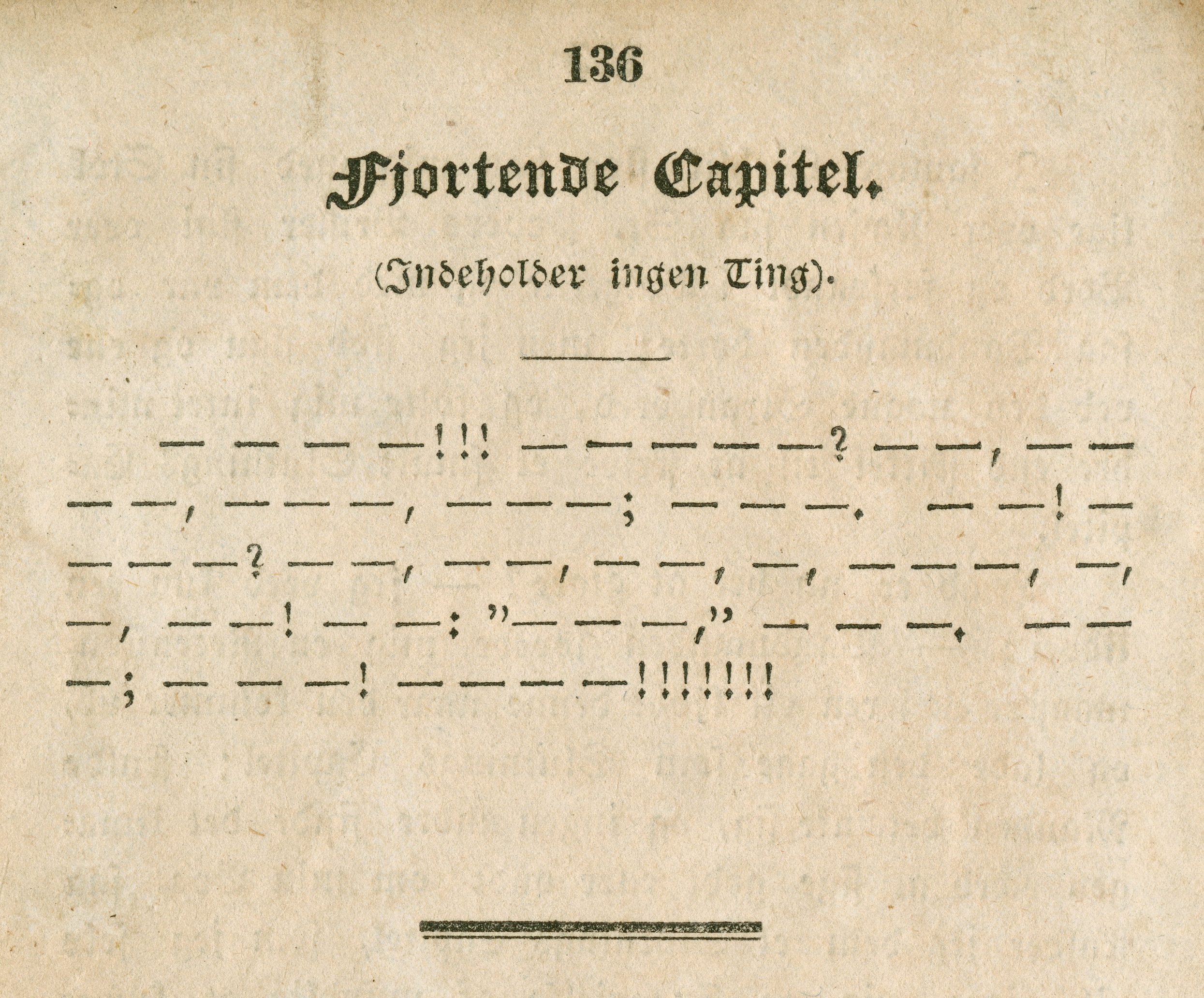 (Ulykkeligviis seer jeg først nu at min Bog er bleven 13 Capitler; da det er for seent at gjøre Forandringer, vil jeg, for at ikke et af Capitlerne skal dø dvs. blive sprungen over, tilføie endnu et fjortende Capitel, som rigtignok ikke indeholder noget, men det er Læserne vant til fra mange andre Bøger: – jeg vil heri alene sætte Interpunctions-Tegnene, saa kan enhver efter eget Behag udfylde det saa herligt han vil).[11]