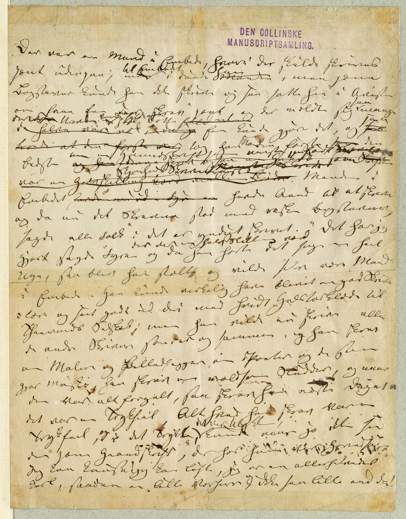 Der var en Mand i Embede, hvori der skulde skrives pænt uden-paa, til Embedet duede han, men pæne Bogstaver kunde han ikke skrive og saa satte han i Avisen om at faae Een der skrev pænt, og der mældte sig saa mange at deres Navne kunde fylde en heel Bøtte. Een kunde gjøre det, og saa tog Manden den første den bedste, men med en Haandskrift som viiste en født Skjønheds-Skrivemaskine.[15]