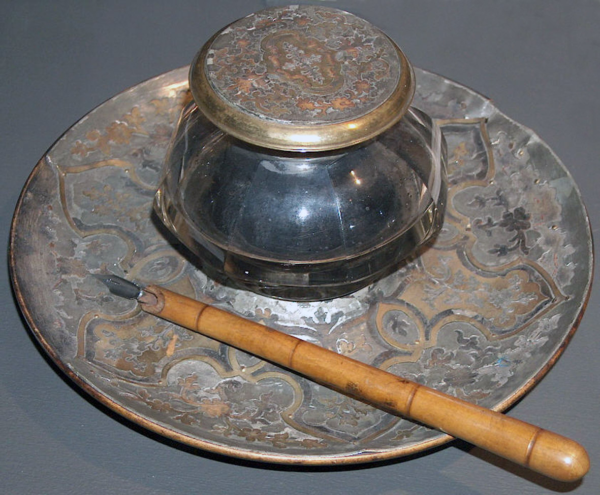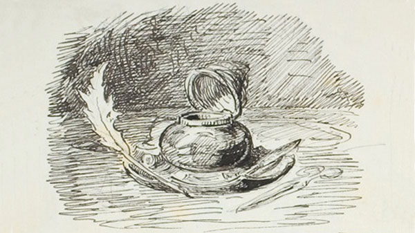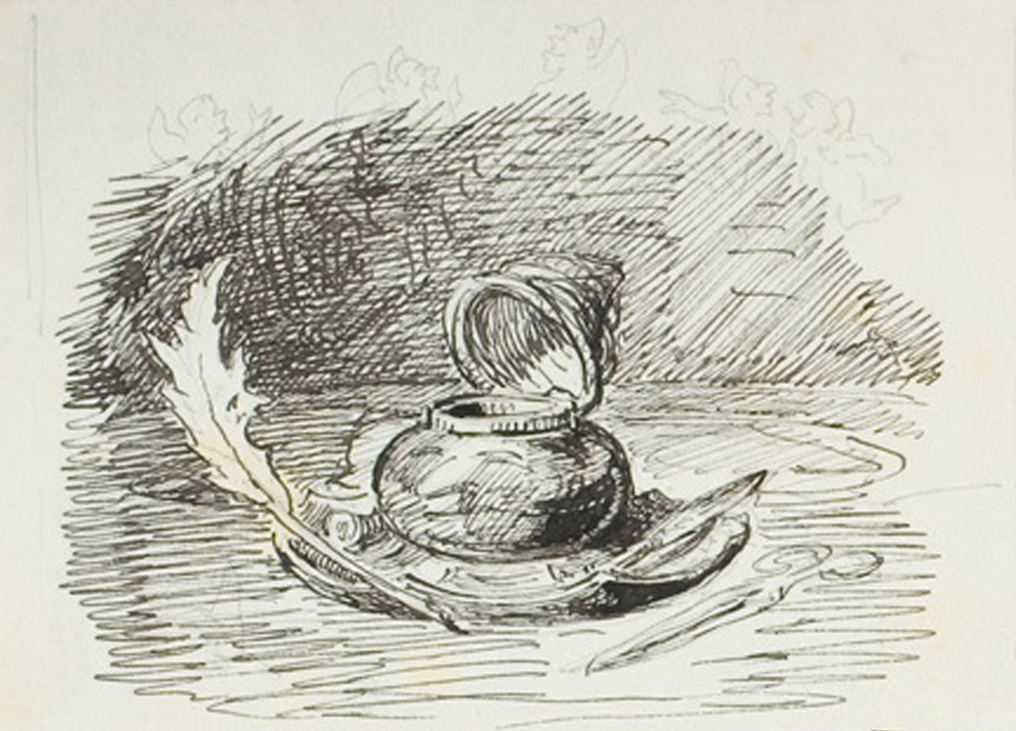 At Andersen virkelig interesserede sig for de tekniske instrumenter, som indgår i selve skriveakten bliver endnu tydeligere, hvis vi ser på eventyret Pen og Blækhuus (1859), hvor den tekniske skriveakt belyses med udgangspunkt i de instrumenter som er involverede i selve tekstproduktionen. I en anden sammenhæng har jeg forsøgt at vise, i hvilket omfang dette eventyr bliver udnyttet af Andersen til at belyse de tekniske mediers egendynamik, som snarere kontrollerer sine brugere end bliver kontrolleret af dem.[18] I dette eventyr er det ikke længere den kreative forfatter som dominerer “Skjønheds-Skrivemaskinen”, men derimod pennen og blækhuset som prototypiske “Skjønheds-Skri-vemaskiner” der dominerer forfatteren. I sin kongeniale illustration til eventyret har Lorenz Frølich tydeligt gjort opmærksom på, at det ikke er digteren, men derimod hans skriveværktøj som kan betegnes som eventyrets egentlige helt.