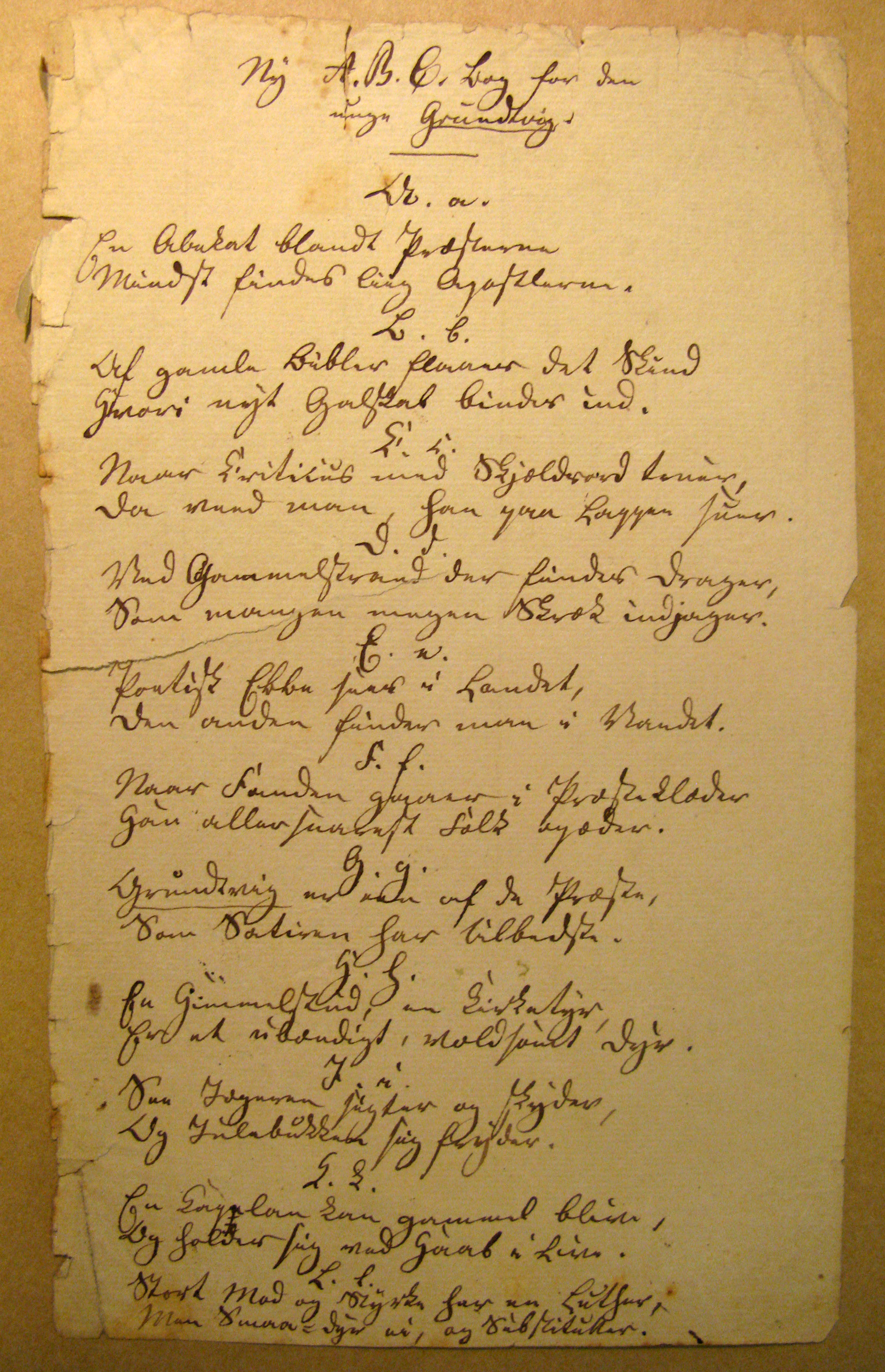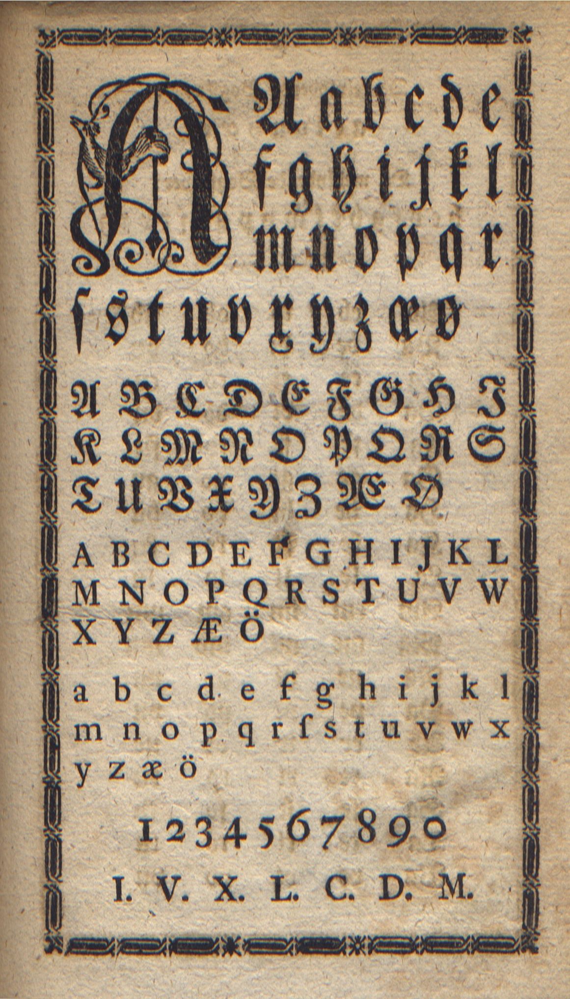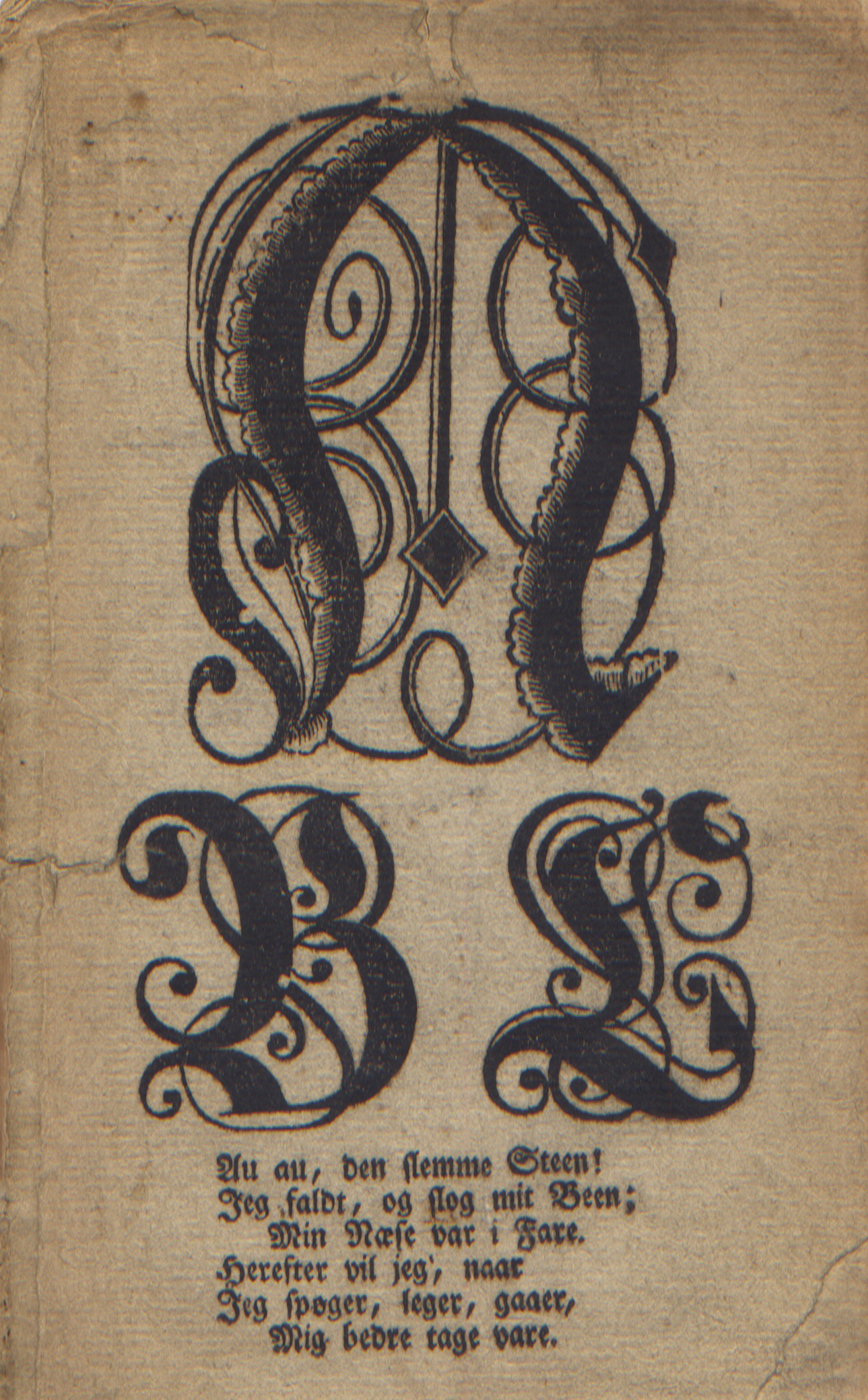 Den gamle Abc vendte opad den første Side, og det er den vigtigste i den, der staae alle Bogstaverne, de store og smaa. Det Blad har nu Alt, hvad alle de andre Bøger leve af, Alphabetet, Bogstaverne, dem, der dog regjere i Verden; en forfærdelig Magt har de! det kommer alene an paa, hvorledes de kommanderes til at staae; de kunne give Liv, slaae ihjel, glæde og bedrøve. Enkelte opstillede betyde de Ingenting, men stillede i Geled, – ja, da vor Herre lod dem lægge under sine Tanker, fornam vi mere, end vi mægtede at bære, vi bøiede os dybt, men Bogstaverne mægtede at bære det.[19]
