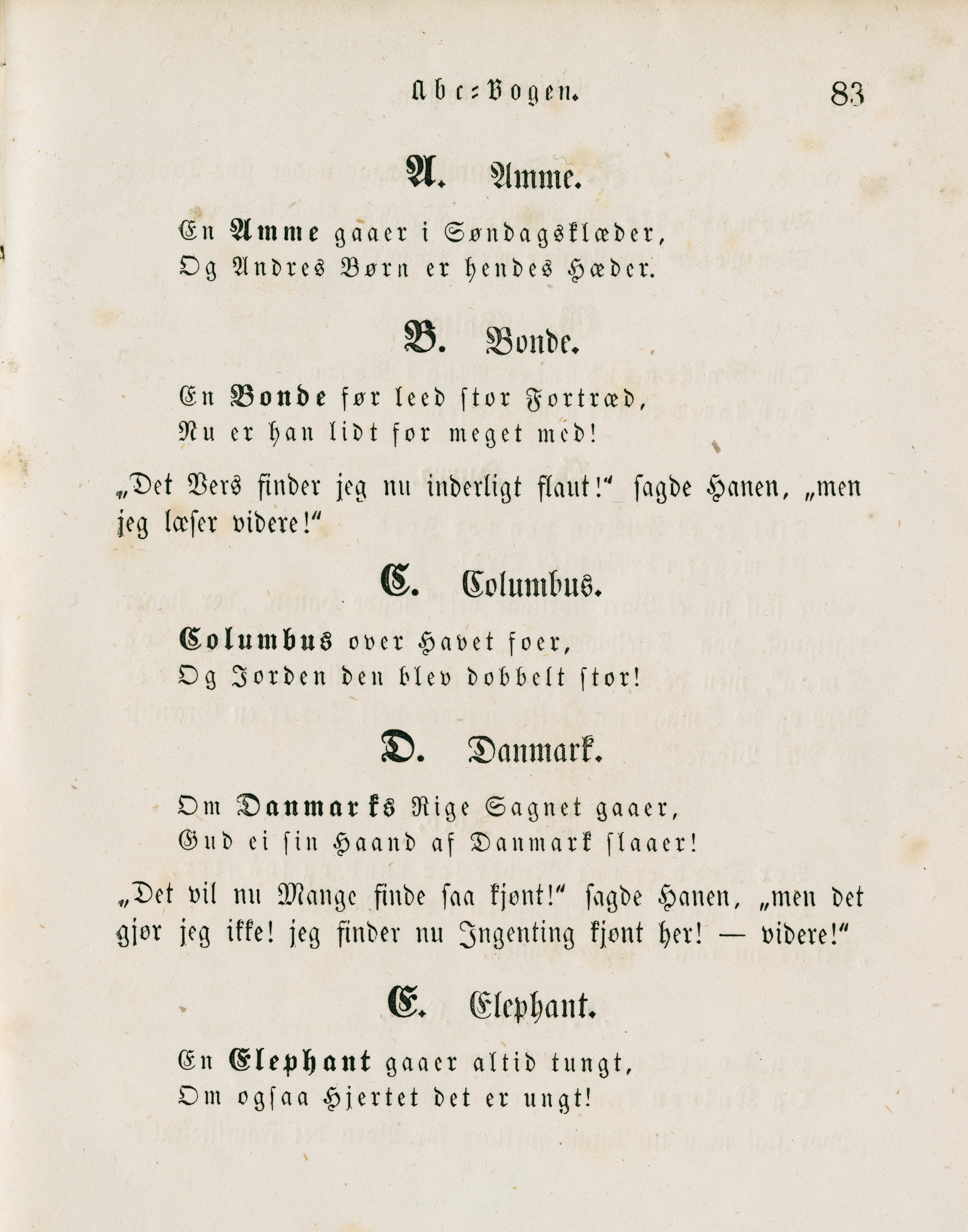 Allerede ved hjælp af denne kommentar opmuntres tekstens læsere til at opfatte tekstens bogstavelige materialitet, det vil sige at se på teksten i stedet for at læse den. Denne materialitet står også i centrum i den efterfølgende handling. En hane, som sidder i bogstavet A, flyver ud af den gamle ABC-bog for at overbevise de andre bøger, som står i bogskabet om, at de nye ABC-verse-liner ikke har nogen værdi: