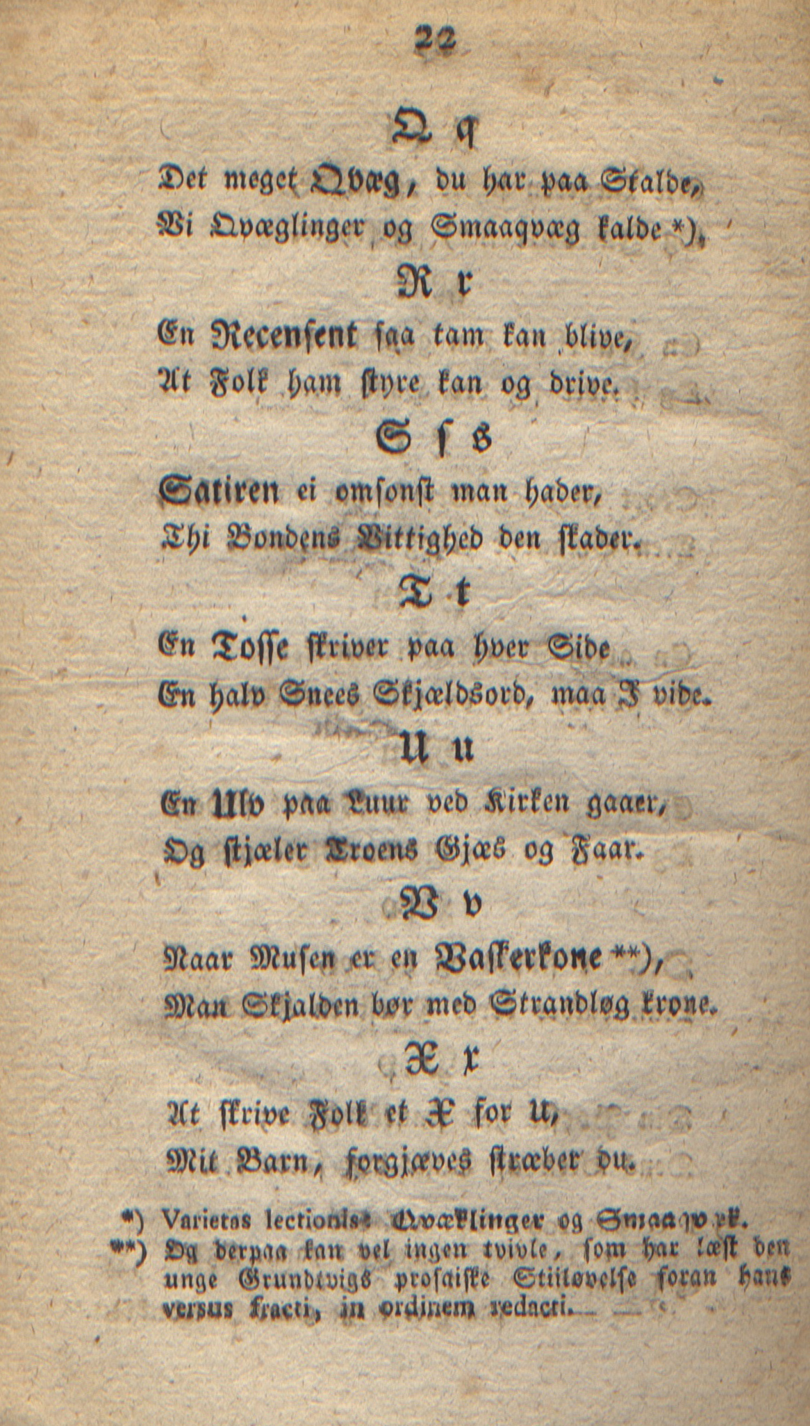 Nu har jeg længe nok talt i Prosa. Nu vil jeg da til Afvexling gjøre et rasende langt Vers. Jeg veed ikke ret, om jeg skulde skrive det i de femføddede Hexametre af min egen Opfindelse. Dog – jeg troer, jeg foretrækker Riim.