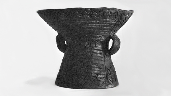 - N F (fig. 3): 105 skår af næsten komplet fodskål. Højde 17 cm. Øvre randdiameter 20 cm. Nedre randdiameter 12 cm. Diameter på vinklen mellem skål og fod 9,5 cm. Skålens højde 8 cm. Randornamentik, både ved øvre og nedre rand: Dobbelt vinkellinie i mejselstik. Skål og fod er fladedækkende ornamenteret med horisontale linier i tæt beviklet snor, som brydes af to hankfelter i vinkelstik lig randornamentikken. På vinklen mellem skål og fod en række af små krydsskraverede rhomber. Hanke båndformede og uornamenterede. Ingen indvendig ornamentik. Felt: G-III, G-IV, H-III, H-IV, H-V.
