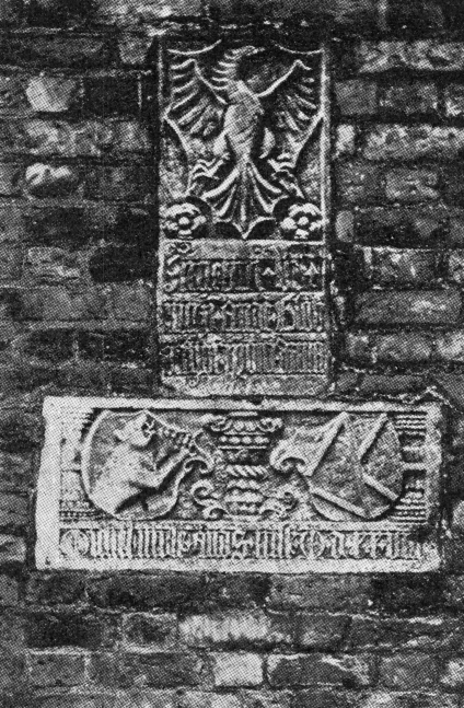 Den nederste og mindste sten måler 60 cm i højde og 53,5 cm i bredde og bærer i relief fire linier med minuskler. I indskriften er tidens forkortelser anvendt, og det hele skal læses: R[everendus] in c[h] r[ist] o p[ate] r d[omi]n[u]s i[o]h[ann]es and[reæ] e[pisco]pus ottonie[ensis]. An[n]o d[omini] 1518 (Den ærværdige fader i Christus hr. Jens Andersen, bisp i Odense. I herrens år 1518). Indskriftens årstal må suppleres med: opførte han denne bygning. Den øvre plade måler 114 cm i højde og 53,5 cm i bredde. Over årstallet 1518 viser den bispens våbenskjold med en tiltagende måne, lagt på en sky, over skjoldet ses en bispehue med to flagrende bånd og bag det to krydsvis anbragte bispestave. Der er spor af farve på figurerne, og det er måske umagen værd ved lejlighed at undersøge, hvor gamle disse rester er. Altertavlen fra Fåborg, der viser et andet eksempel på våbnet med targeformet skjold, har farverne gul måne på en blå sky i gult felt. Jens Andersen var ikke som de fleste af hans kaldsfæller i denne periode af adel, og våbnet har han åbenbart selv sammensat. Det benyttes allerede af ham i 1505 som bisp, men i dette ringsignet har skjoldet form som en targe som på altertavlen fra Fåborg.[2] I Niels Skaves gravskjold i Roskilde domkirke er en prøve på denne type overleveret som et enestående minde.[3] Reliefstenen viser derimod et helt andet skjold, det italienske eller florentinske, mere malende kaldet hestehovedskjoldet efter sin form. Jens Andersen benyttede det i sit bispesegl, der kendes fra samme år som ringsignetet,[4] og det kan således se ud, som om han ikke har lagt vægt på den ydre skikkelse, men det er værd at bemærke, at reliefstenen benytter samme skjoldform som bispeseglet, og den findes også på et stykke kirkeligt inventar, der er særlig knyttet til bispen. I Nørholm kirke i Hornum herred findes en altertavle, som i midtskabet har en korsfæstelsesfremstilling, mellem hvis figurer også bispen ses og ved siden af ham hans våbenskjold med en vildmand som skjoldholder, og skjoldet er ligeledes her af den italienske type. Den ene af fløjene viser Sct. Knud af Odense, og skjoldet, hvortil den kongelige helgen støtter sig, er af samme form.[5]