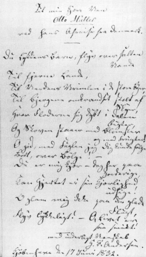 Desuden ligger der sammen med Andersens breve til Müller i Det kgl. Bibliotek også et hidtil utrykt digt med flg. påskrift af Otto Müller: