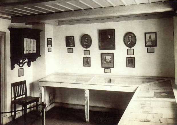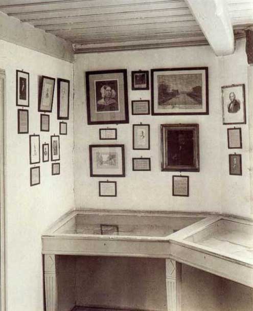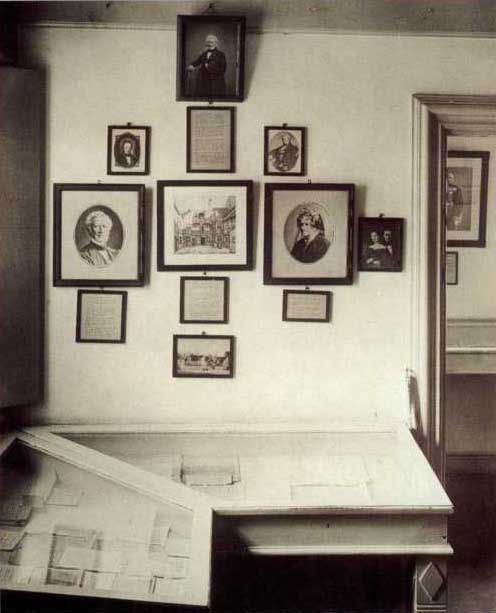 Langs ydervæggen var pultmontrer opstillet, og her kunne man nyde en udstilling om digterens første 20 år: Dåb, konfirmation, de første år i København og læreårene i Slagelse, Helsingør og København. På væggene hang billeder af den collinske familie, to rammer med en mængde fotografier af H.C. Andersen og pudsigt nok også en papmodel af Melchiors landsted “Rolighed”, hvor digteren udåndede i 1875. Modellen blev få år efter også flyttet til et andet rum.