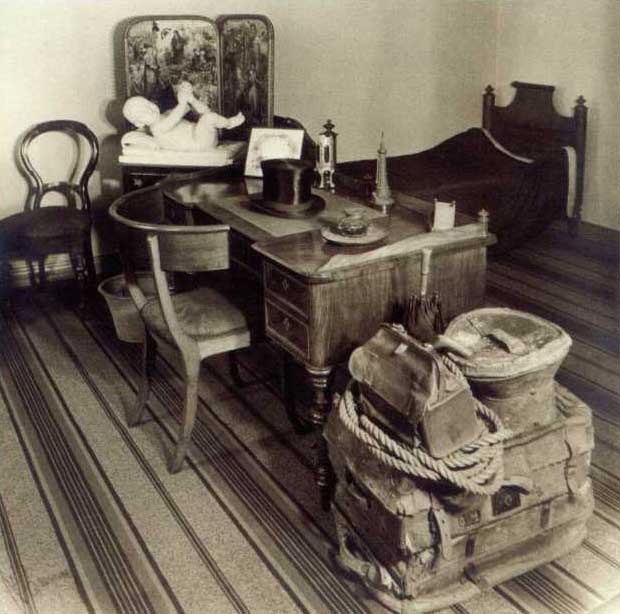 Det næste rum, gæsten betrådte, var hjørneværelset, hvor man ligeledes fra pultmontrer og billeder på væggene kunne følge digteren på vej mod berømmelsen og på vej igennem Europa. De udstillede genstande var fremlagt i kronologisk orden, således “har man Lejlighed til at se, hvorledes Eventyrene lidt efter lidt giver Digteren Berømmelse i Udlandet og Anerkendelse i Fædrelandet”[4]. På væggene hang bl.a. billeder af H.C. Andersen, Riborg Voigt og storhertug Carl Alexander af Saxen-Weimar-Eisenach.