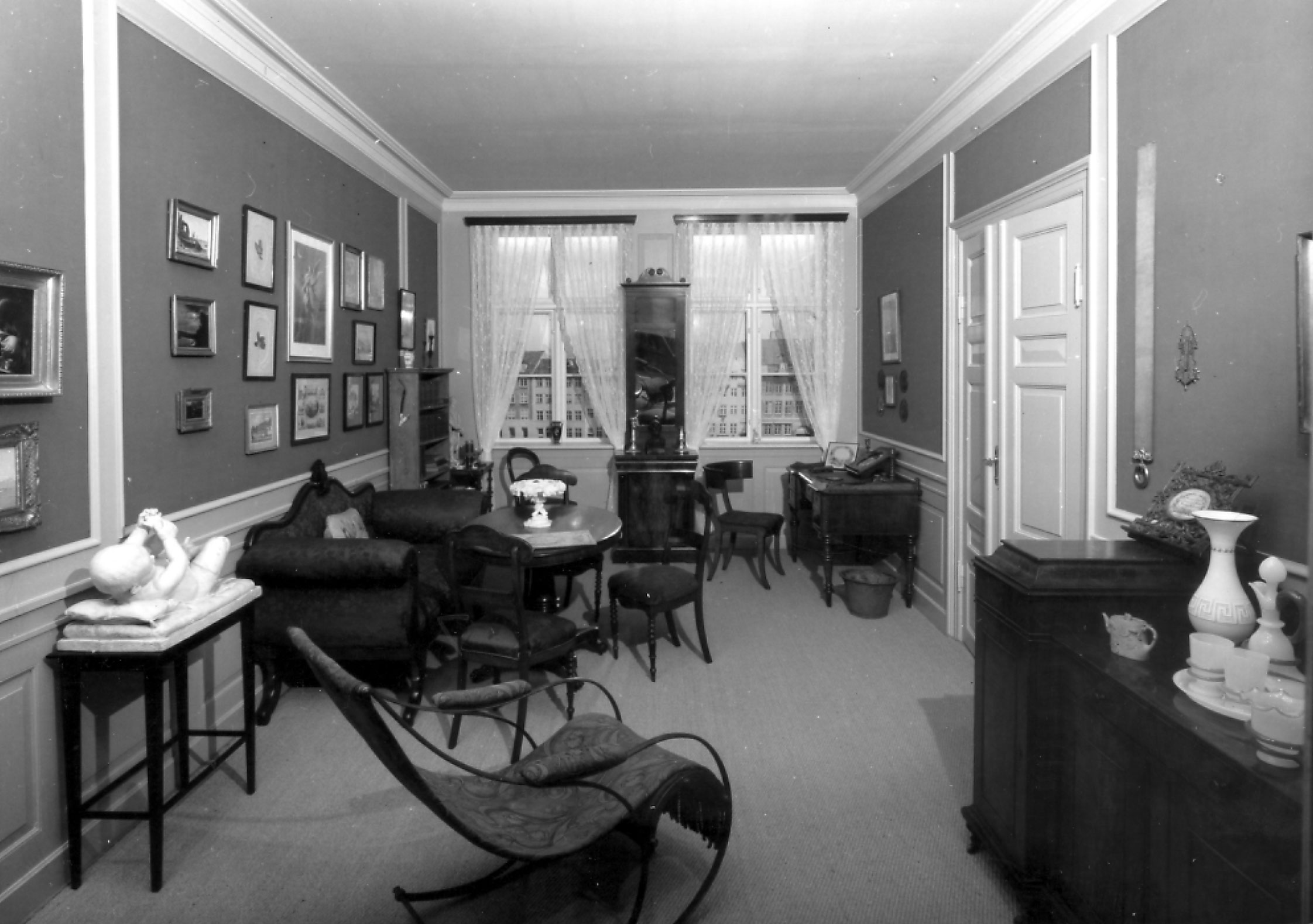 Den videre tur i museet gik via en nu tilmuret dør, der forbandt hjørnehusets nuværende rum 6 og 3 med hinanden. I værelset med udsigt til gården kunne gæsten betragte Louis Hasselriis’ udkast til Andersens statue i Eventyrhaven, originaltegninger af Lorentz Frølich og – senere – papmodellen af Melchiors landsted.