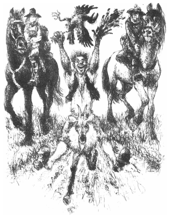 “Maa jeg ingen Hest faae,” sagde Klods-Hans, “saa ta’er jeg Gedebukken, den er min egen, og den kan godt bære mig!” og saa satte han sig skrævs over Gedebukken, stak sine Hæle i Siden paa den og foer afsted hen ad Landeveien. Hui! hvor det gik. “Her kommer jeg!” sagde Klods-Hans, og saa sang han saa det skingrede efter.