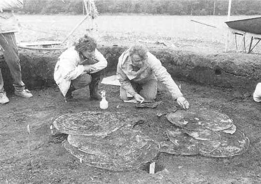 Sköldarna var svårt krackelerade, varför det syntes omöjligt att slutföra utgrävningen i fält. Vi tog däfor upp sköldarna i fyra stora preparat och förde dem till Arkeologiska Forskningslaboratoriet i Stockholm, där de genast frystes ner. Preparaten undersöktes 1986 resp 1988. Sammanlagt 16 sköldar har identifierats ur de tusentals fragment, som till sist kunde plockas fram ur gyttjan och ur kringliggande odlingslager.