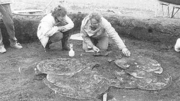 Fig. 1. Förf. visar de framgrävde Fröslundasköldarna för journalisten Bodil Hanell vid Radio Skaraborg. I hålet mellan de två sköldgrupperna har de först upplöjda sköldarne legat. Sköld (nr. 9) längst upp tv vid flaskan är vänd med baksidan upp och täckt av tjock vassrödler.