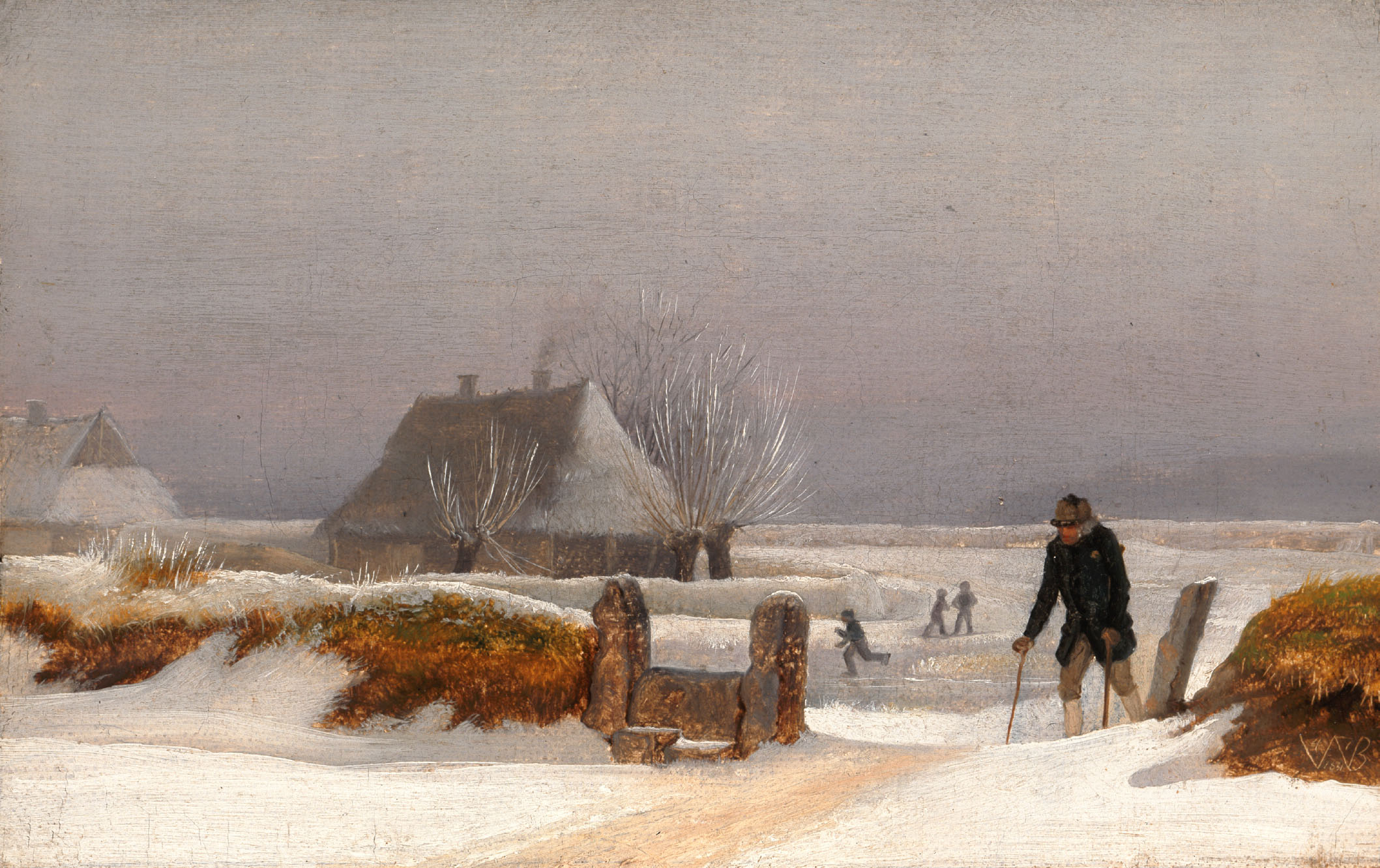 I det lille billede Vinterlandskab i Fyen fra 1831, jf. foto ses netop denne intime og fordybende oplevelse af lyset i et snelandskab. Et par huse omgivet af stynede popler og et gærde danner sammen med fire personer billedets motiv. Kompositionelt danner billedets personhandling en aflang oval, skabt af de fire personer, der ses gående, løbende eller stående.