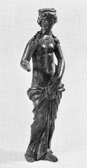 Figuren er 9.9 cm høj og noget medtaget af sit lange ophold på loftet. Dengang den blev fundet var den helt glat i overfladen, nu har irren brækket overfladen af flere steder, men endnu er det meste af overfladen forbløffende velbevaret, pænt glatpoleret fra støberens side. Der er ikke angivet nogen form for beklædning; det eneste der er gjort rede for er frisuren, med midterskilning og nedadtil en vandret linie, som afgrænser håret mod ansigtet. Næsetippen er brækket af, nakken skallet af og maveskindet ligeså, tåspidserne mangler. Værst er det gået ud over ryggen. Den er hul og har haft lige kanter, men de er brækket af i flere millimeters tykkelse. I hver side er der rester af et hul, hvorigennem et løst sæt arme må have været stukket.