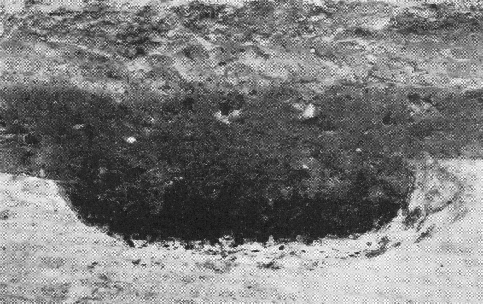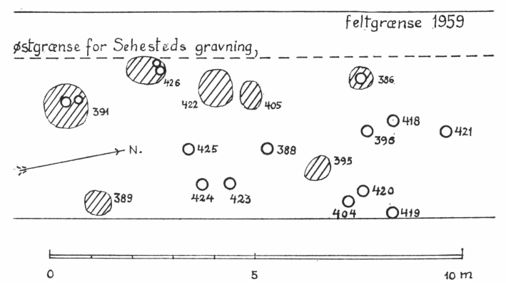 Mellem landevejen og mindesmærket breder sig da den plads, hvor Sehested tog fat i 1876. Da arbejdet indstilledes seks år senere, havde han med største omhu gennemsøgt et areal 60 m langt i nord-syd, 18 m bredt. På grundlag af en klar udgravningsplan i Archæologiske Undersøgelser kunde feltets østgrænse nu uden større besvær genfindes. Skellet måtte ligge 18 m øst for landevejsdiget. Vi afstak derfor en linie 17 m øst herfor, parallelt med diget, og da vi gravede det anlagte felt i dybden, tegnede sig noget nede en skarp linie, som angav skiftet mellem undersøgt og urørt jord.