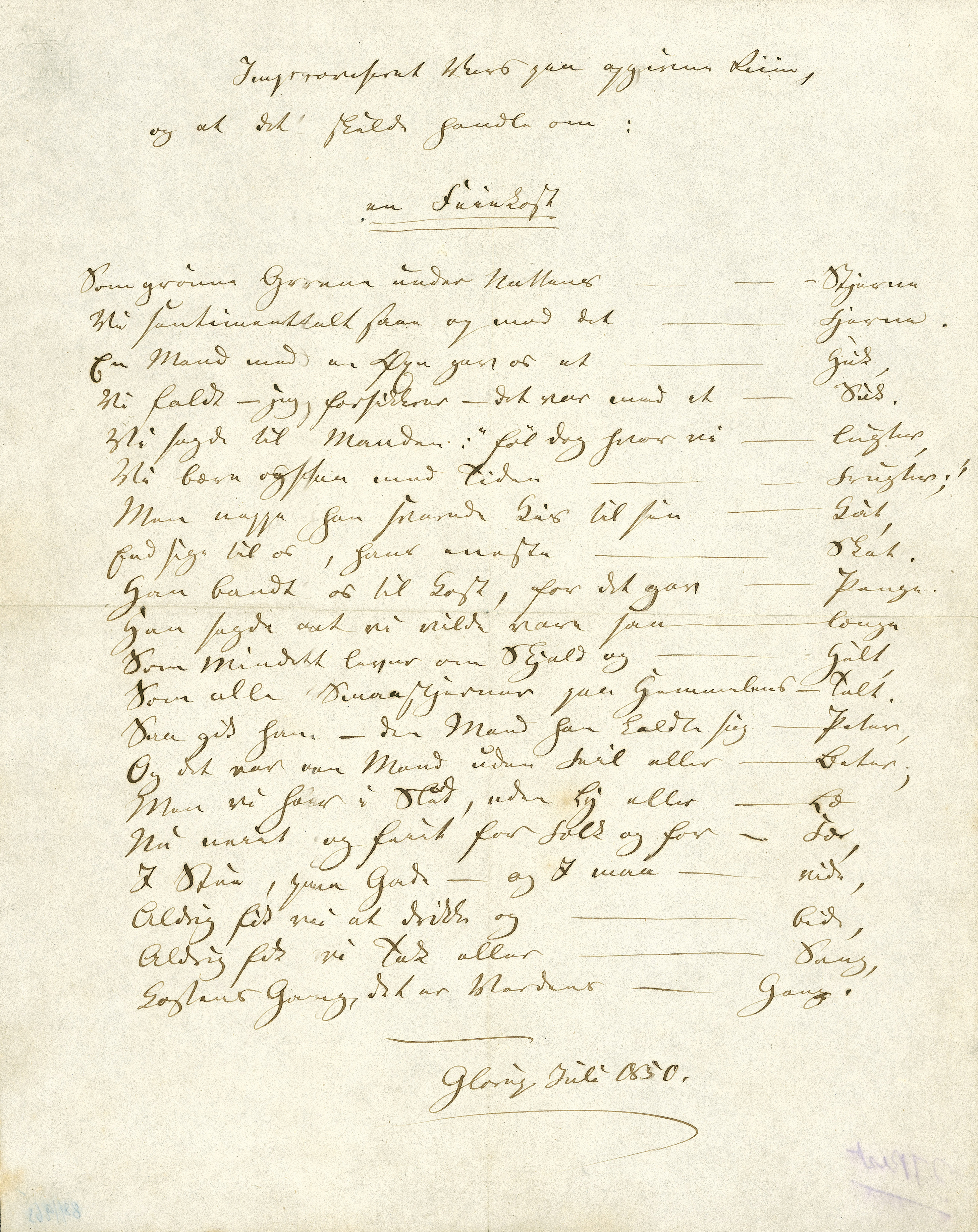 I et manuskript til et bouts rimés, der skulle skabes over rimparrene Kjærne / Stjerne, nære/Pære, står de første to linjer skrevet med hastig hånd og uden rettelser:
