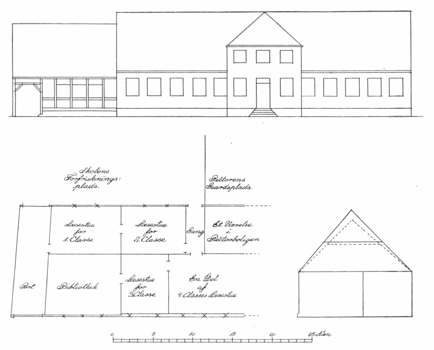 Opstalt og grundplan af skolebygningen i 1826 før ombygningen.