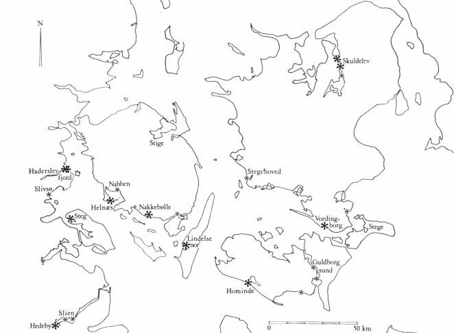 Første etape heri var kortlægningen af spærringerne i Roskilde fjord, hvor der fandtes anlæg af forskellig art i fjordens øvrige render omkring Peberrenden, samt ved Frederikssund og Eskildsø[1]. Så fulgte studier i bibliotek og arkiv i et forsøg på at lokalisere spærringer andetsteds gennem den topografiske litteratur, hvor der dog, bortset fra Nationalmuseets undersøgelser i 1930-erne af en spærring af Hominde ved Rødby fjord,[2] ikke var meget konkret at hente. For stednavnenes vedkommende skulle det vise sig at være givende at tage pejling af visse navne, afledt af ordene stok, stage og pæl, som ifølge en svensk undersøgelse fra Stockholmsområdet ofte optræder ved sejlspærringer bestående af nedhamrede pæle.[3] Sådanne stednavne findes en del steder på Danmarkskortet på lokaliteter, der er åbenbart velegnede til placering af en spærring, ved mundingen af en fjord, indløbet til et nor eller lign. I 1964 redegjorde V. Wåhlin for resultatet af disse undersøgelser af de skriftlige kilder i en artikel i Skalk[4]. Foruden spærringerne i Roskilde fjord og ved Hominde var fundet beretninger om pælespærringer i Slien, ved Flensborg, i Haderslev fjord, Svendborg, Nysted og i Guldborgsund. Samtidig pegede stednavnene Steg, Stege, Stig og Stavns mod en række lokaliteter, der efter Wåhlins opfattelse burde undersøges arkæologisk for spor af spærringer.