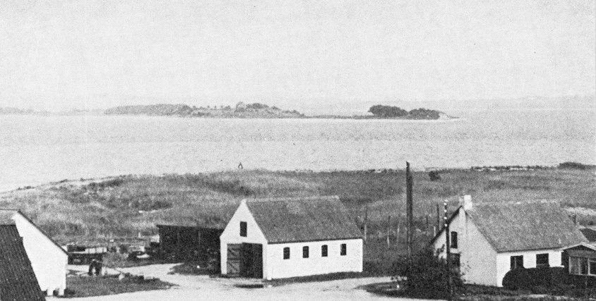 Fig. 2. Udsigt fra Helnæs østover mod Illumø med Horneland i baggrunden. Det opfiskede tømmer stammer fra det lyse område i vandet, over den hvide garage.