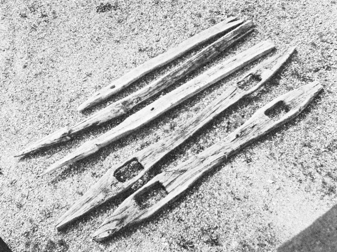 Fig. 3. Pæle og flydere fra Helnæs-spærringen, opfisket ca. 1960 og oplagt i Helnæsstrand.