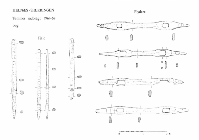 Tømmeret, der var bragt i land fra spærringen, var som nævnt af særpræget form, og det faldt klart i to grupper, lodrette pæle og vandrette flydere (fig. 3).