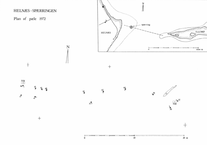 Resultatet af dette arbejde blev, at dykkerne lokaliserede et ca. 30 m langt område med ialt 13 pælestubbe og en flyder. Pælestrækket lå i øst-vestlig retning på 1,6-1,8 m’s dybde, ret udfor Helnæs’ østligste punkt i en afstand af 200 m fra stranden, (fig. 5). Afstanden mellem Helnæs og Illumø er i dag på dette sted ca. 1.000 m, hvoraf de første 250-300 m udgøres af det relativt flade sandflak, som af strømmen er aflagt på Helnæssiden, Udenfor flakket følger en 3,7 m dyb strømrende, og på østsiden af indløbet stikker Vesterhoved på Illumø frem som en spids morænedannelse under stadig nedbrydning. Udenfor Vesterhoved strækker et 400-500 m bredt flak af sand og muslinger sig vestover og indsnævrer sejlrenden, så den strækning, som spærringen må have rakt over, ikke har været så lang som afstanden mellem Helnæs og Illumø i dag angiver. Det lykkedes ikke at spore yderligere pæle fra spærringen, hverken i sejlløbet eller i bunden udfor Vesterhoved, hvor undersøgelsen dog hæmmedes stærkt af, at bunden var tæt besat med muslinger.