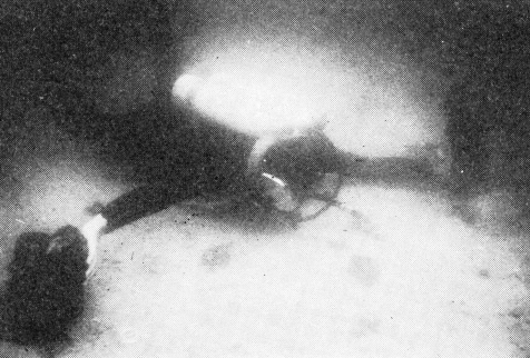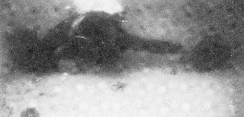 Fig. 6. Undervandsfotos af dykker, der ved sit armspænd anskueliggør forskellen mellem den kortere pæleafstand i øst-vestlig retning (øverst, pæl nr. 35 og 41) og den længere afstand i nord-sydlig retning (nederst, pæl nr. 37 og 46).