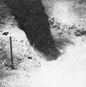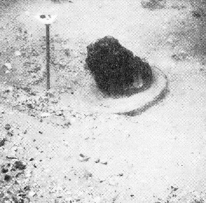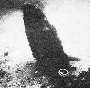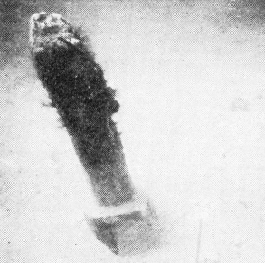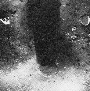 En sådan variation passer dårligt med teorien om, at pælene skulle være rammet skråt ned, og en heldig opdagelse gjorde det muligt at fastslå, at ihvertfald pæl nr. 35 er blevet rammet i lodret stilling og siden presset ud af lod. Ved forsigtig bortvaskning af sand omkring denne pæl fremkom nemlig ca. 10 cm under det nuværende bundniveau en rund aftegning i sandet (fig. 7c), dannet ved, at den koniske pælespids under nedramningen har sammentrængt den oprindelige sandbund med dens indhold af mange små kalkskaller. På et senere tidspunkt er pælen så presset skæv, hvorved der er dannet en hulhed i sandbunden omkring pæleroden, og dette hul er da opfyldt med løst sand uden kalkskaller.