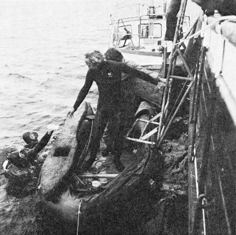 Fig. 8. Den fundne flyder tages ombord i „Fulton“ den 25. juli 1972.