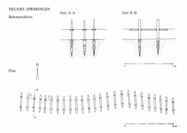 Så længe spærringen har været intakt, har den utvivlsomt været effektiv overfor indtrængende skibe af den art, som såvel danskerne som venderne benyttede til krigstogt – Ladbyskibets type i forskellige modifikationer, som vi i dag kender dem fra Skuldelev-fundets to krigsskibe[10] og fra fund af slaviske varianter over samme byggeform, omend i mindre størrelse, fra Ralswiek på Rygen[11], Orunia ved Gdansk[12] m.v. Disse spinkelt byggede fartøjer kan passere, hvor der er blot ½ m fri vanddybde, og de kan trækkes over en landtange, men ved mødet med en spærring som denne, kan de hverken slippe mellem pælene eller hugge sig vej igennem uden fare for, at pælestubbene skal ødelægge skibene.