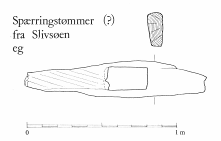 Fig. 10. Formodet spærringstømmer (½ flyder) fundet i Slivsøen syd for Haderslev.
