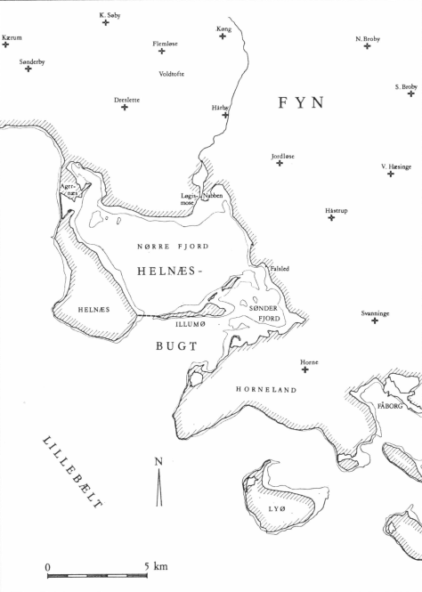 Fig. 11. Kort over Helnæsbugten og den tilgrænsende del af Fyn. Kortet viser, at en effektiv afspærring af Helnæsbugten har været en god beskyttelse for bebyggelsen i baglandet, her markeret ved områdets romanske kirker.