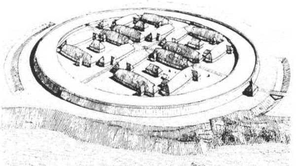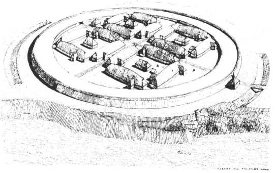 Fig. 1. Rekonstruktionsskitse af vikingeborgen Fyrkat ved Hobro. Skitsen viser de karakteristiske elementer, som borgtypen består af. Udeladt er dog ringgaden, som har løbet langs voldens inderside. (Efter Olsen & Schmidt. 1977:107).