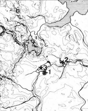 Fig. 2. Kotekort over Odense-området med angivelse af vandforholdene. Specielt området, hvor havnen nu ligger ved den udtørrede Næsbyhoved Sø, er stærkt ændret. Ækvidistance 2,5 m. 1. Nonnehakken. 2. Vikingebebyggelse ved Ejby Mølle. 3. Vikingebebyggelse, Vestergade 70-74. (Efter Christensen 1988:30 med tilføjelser).