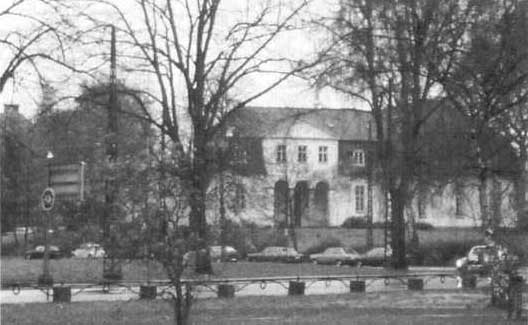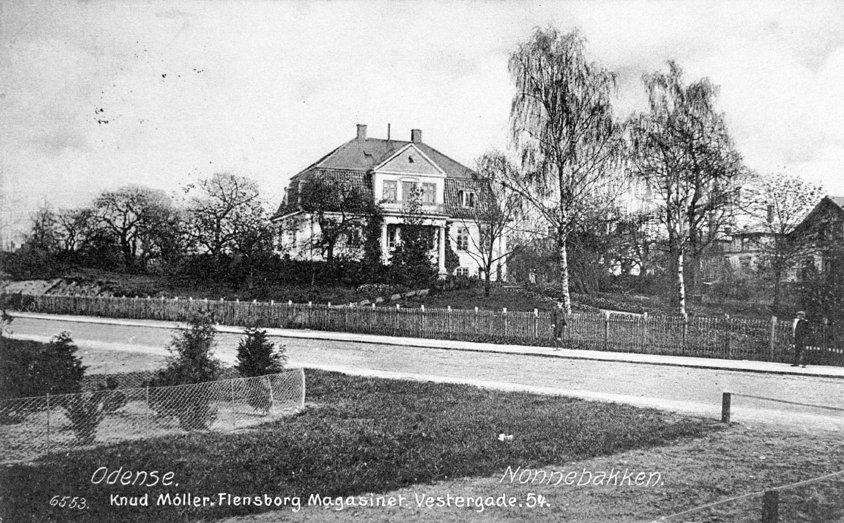 Fig. 3. Nonnebakken set fra nordvest; øverst på et postkort – sandsynligvis fra kort efter århundredeskiftet, nederst i november 1992. Bygningen øverst er prokurator Rasmus Rasmussens villa fra 1837. I baggrunden til venstre for bygningen ses en forhøjning i terrænet, som er delvis skjult af buskadset. Det er resterne af ringvoldens nordøstlige del, der blev gravet bort i 1909. Bygningen nederst er Odd Fellow-logens bygning, hvori den gamle villa indgår. Terrænet bag bygningen er nu afgravet og udjævnet. (Øverst: postkort Møntergårdens billedsamling, 13/1981 – nederst forf. foto).