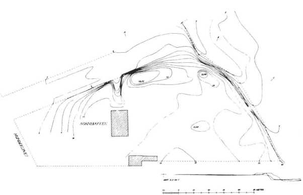 Fig. 4. Koteforholdene på Nonnebakkens nordlige del før bortgravningen af de sidste voldrester i 1909. To knolde står tilbage helt op til over kote 12,50 – idag ligger skolegården til Giersings Realskole samme sted i ca. 9,60, hvilket er en god halv meter højere end . terrænet i vikingetiden. Ækvidistance 0,5 m. (Efter Olsen & Schmidt 1977:89).